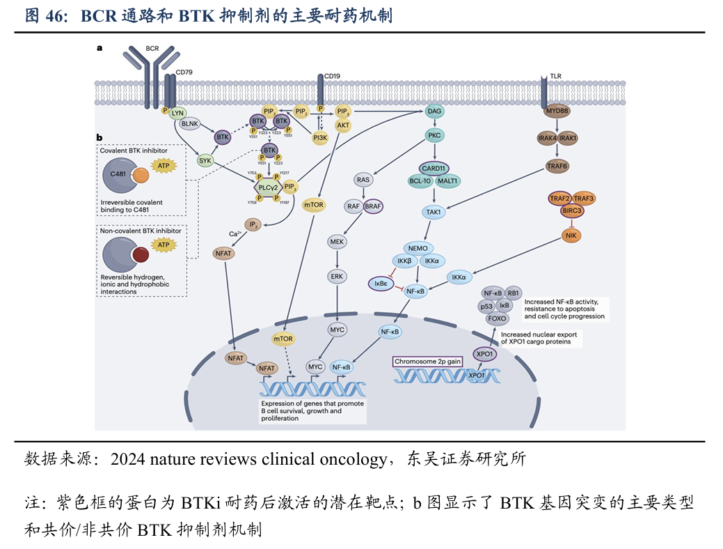 在接受BTK抑制剂治疗的B-NHL患者中,已发现主要两种耐药机制:1、BTK基因突变,尤其是C481X突变阻断共价抑制剂与BTK的结合位点(图43b),BTK下游的PLCG2基因突变也是常见的耐药机制之一;2、BTK酶失活或活性显著降低引起引发非BTK依赖性BCR信号传导途径激活(非BTK依赖性突变)。当前,尚无药物能同时应对这两种耐药机制。