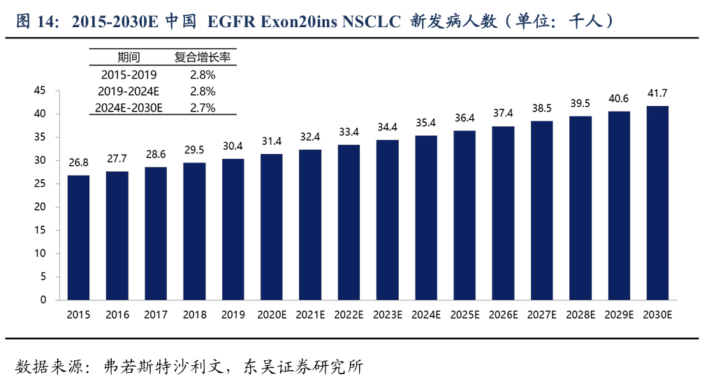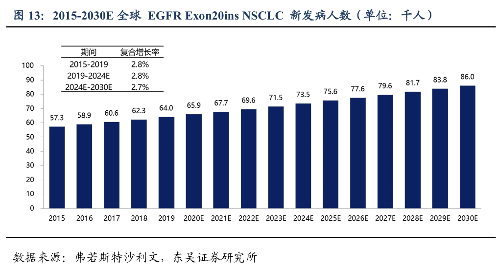 根据弗若斯特沙利文测算,从2015年到2019年,全球EGFR Exon20ins的非小细胞肺癌新发患者的数量从5.7万增加到6.4万,年复合增长率为2.8%。我们预计到2024和2030年,全球的EGFR Exon20 ins的非小细胞肺癌新发患者人数将分别达到7.4万和8.6万人。