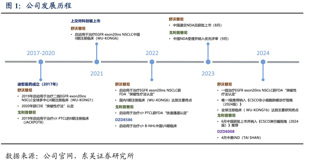 迪哲医药成立于2017年,2021年12月成功在科创板上市,是一家具备全球竞争力的创新驱动型生物医药公司。公司致力于开发具备差异化竞争优势的全球创新药物,坚持源头创新,专注于新靶点的发现和作用机理验证。目前,公司已经建立起具备全球竞争力的研发管线,其中舒沃替尼是全球唯一全线获FDA与CDE突破性疗法认定治疗EGFR Exon20ins 突变型晚期非小细胞肺癌(NSCLC)且同时在中国获批NSCLC相关适应症的酪氨酸激酶抑制剂(TKI),戈利昔替尼是全球首个且唯一获FDA快速通道认定针对外周T细胞淋巴瘤(PTCL)且在中国获批上市用于治疗复发/难治PTCL的JAK1抑制剂。