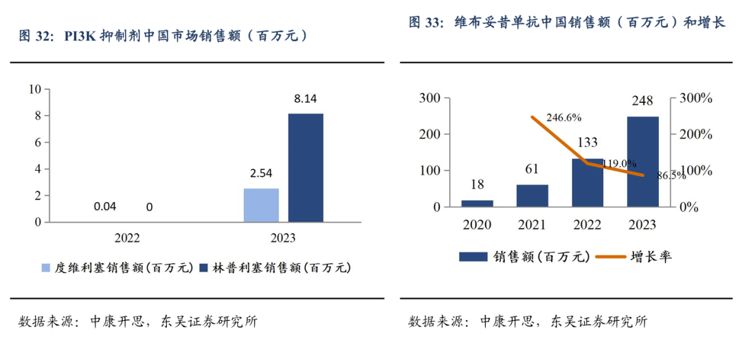 国内针对r/r PTCL 获批上市的创新药较少,在FDA近年来批准的 PTCL治疗药物中,使用较多的贝利司他还暂未在中国上市。目前国内获批的单药治疗药物为 HDAC 抑制剂西达本胺,叶酸拮抗剂普拉曲沙以及 PI3Kδ抑制剂度维利塞和林普利赛。目前,上市较早的西达本胺占领国内复发难治性 PTCL 药物主要市场份额。根据中康开思数据库测算,2023年西达本胺国内销售额为4.2亿元,同比增长11%。维布妥昔单抗2020年5月在国内上市,2023年国内销售额约为2.5亿元。PI3K抑制剂近两年陆续在国内上市,销售体量还较小。普拉曲沙2024Q1国内正式获批开始商业化。