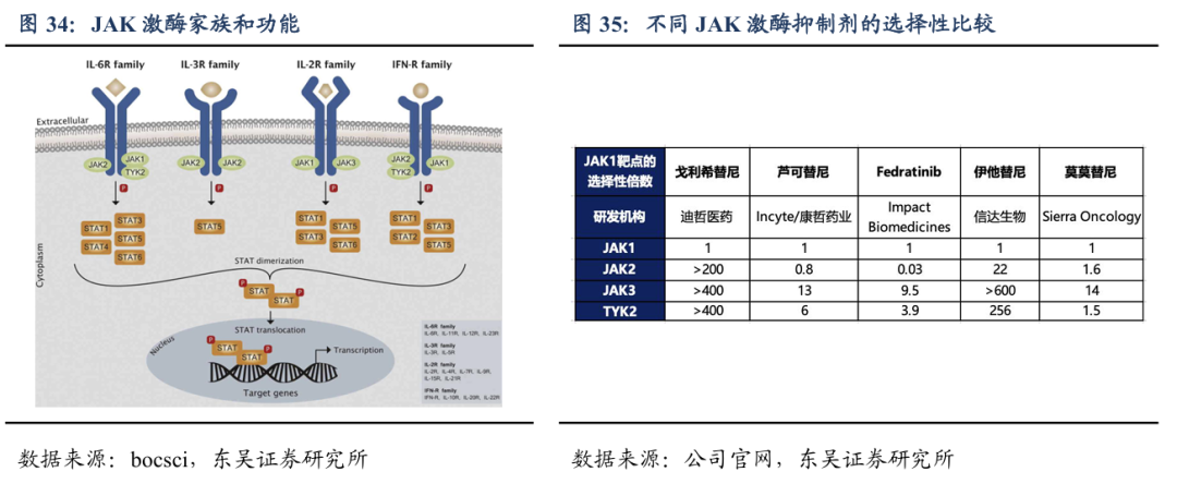 JAK是一种非受体型酪氨酸蛋白激酶,JAK激酶家族的蛋白有4个,分别为JAK1、JAK2、JAK3、TYK2,不同的受体结合选择不同的JAK蛋白。JAK1广泛存在于体内各种组织和细胞中,与IL-6、IFN等炎症因子的激活密切相关,是免疫、炎症等疾病领域的重要靶点。不同的JAK激酶亚型由不同的细胞因子激活,目前多数JAK抑制剂选择性较差,一般对多个JAK 激酶都具有抑制作用。由于现有的大多数非选择性JAK抑制剂均对JAK2有抑制作用,因此容易产生贫血等较大的毒副作用。戈利昔替尼的设计原则是提高对特定JAK1亚型的选择性抑制(大于200倍),避免由于抑制 JAK2带来的毒副作用,在保持药物对特定疾病疗效的同时降低不良反应。