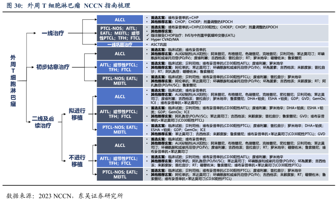 美国国立综合癌症网络(NCCN)临床实践指南中针对PTCL的治疗方案和国内的CSCO指南相似,一线治疗药物也是维布妥昔单抗和多种化疗联合方案。二线及后续治疗首选药物主要包括:维布妥昔单抗(CD30 ADC)、ALK抑制剂、贝利司他(PI3K/HDAC抑制剂)、度维利塞(PI3K抑制剂)、罗米地辛(HDAC抑制剂)等。