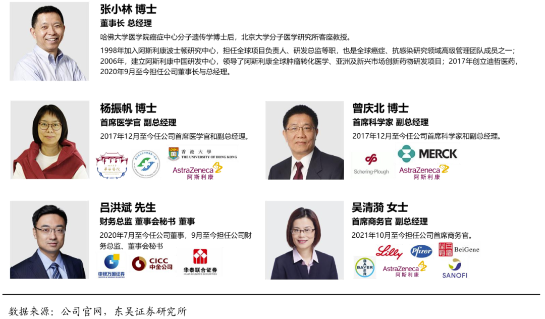 公司的核心管理团队具有十余年的医药行业工作经验,拥有丰富的全球创新药领域管理、研发和商业化经验。公司董事长兼总经理张小林博士是北京大学分子医学研究所客座教授和哈佛大学医学院癌症中心的博士后,曾在阿斯利康担任全球副总裁并建立中国创新中心。首席医学官杨振帆博士拥有超过20年的临床实践和药物研发经验,曾在阿斯利康中国创新中心担任项目总监和医学总监。首席商务官吴清漪女士拥有20多年商业化销售经验,曾在拜耳、礼来亚洲、辉瑞和阿斯利康等跨国药企任职,曾任百济神州大中华区首席商务官。这些资深团队成员的多元背景和专业知识为公司的高质量发展提供了坚实的支持。