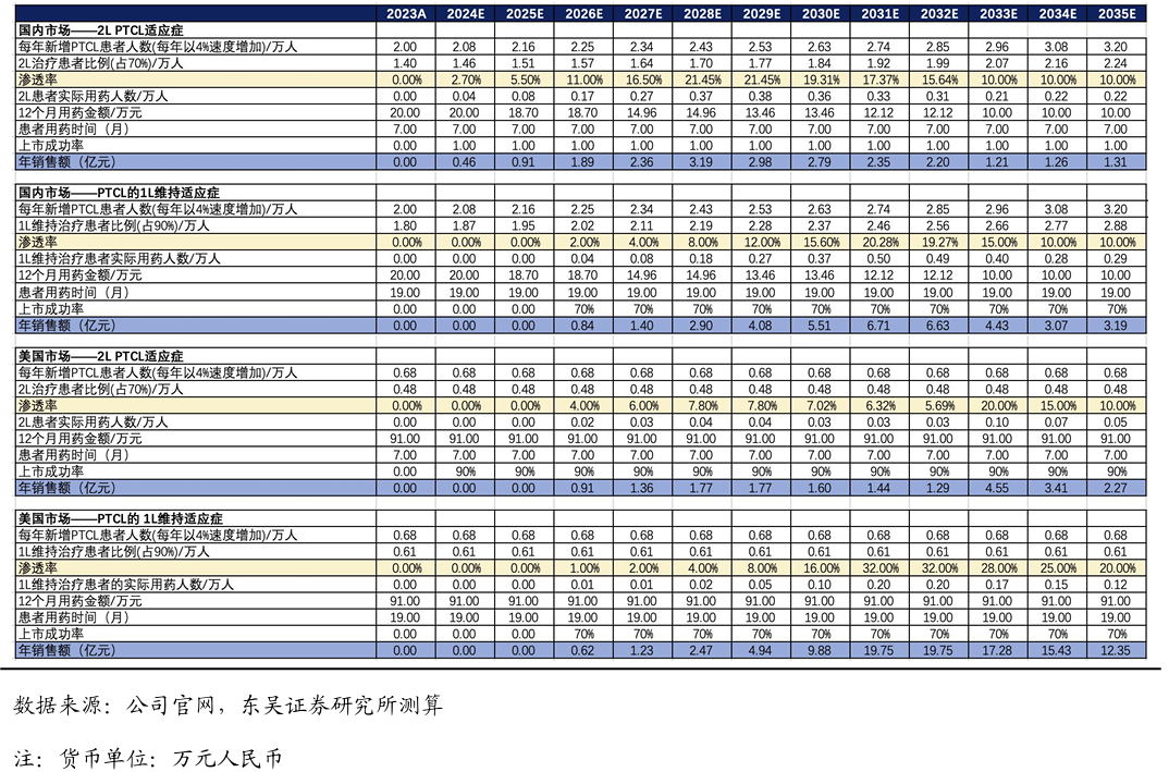 渗透率假设:针对r/r PTCL,戈利昔替尼的竞争格局良好,潜在同类最佳分子。假设二线及以上治疗峰值渗透率为21%;一线维持治疗的峰值渗透率有望达到20%。美国的渗透率有望分别达到20%和32%左右。