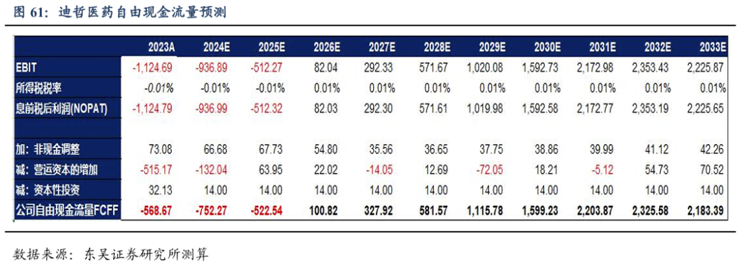 采用绝对估值法中的FCFF估值:迪哲医药研发能力强,临床推进快,目前已经实现了两款国内上市的创新药,有望今明两年海外实现两款创新药的上市。在研管线竞争格局良好,持续推进新产品在中国和海外实现获批上市,我们给1%的过渡期增长率和0.5%的永续增长率,贝塔值β为1,WACC值为5.17%。根据下表可以得出,公司的四款产品的绝对估值总数为343亿人民币,对应目标股价为82.26元/股。迪哲医药国内商业化顺利推进,产品出海确定性高,在研品种潜力大,首次覆盖给予“买入”评级。
