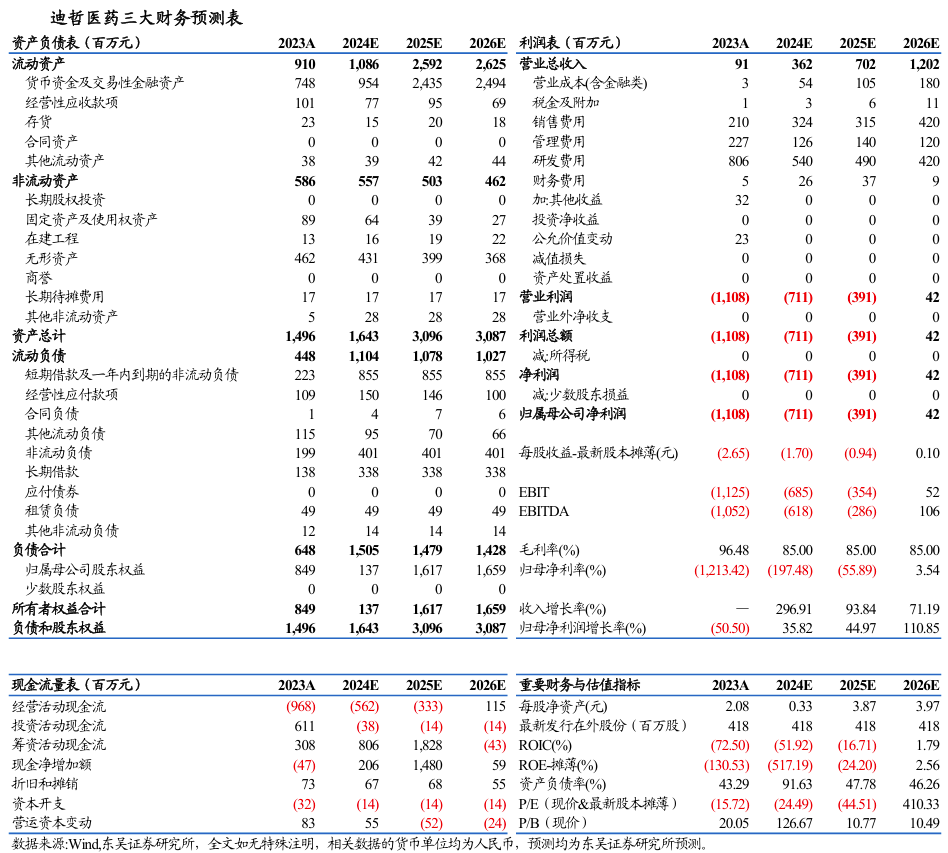 我们预计迪哲的国内4个产品的销售收入我们预计2032年达峰,峰值为60亿元,按照9.2倍PS计算,折现后(10%折现率10%)贡献约257亿元市值;海外暂时只考虑舒沃替尼和戈利昔替尼的销售,销售峰值我们预计15亿美金(2031年),约贡献15亿人民币利润(行业平均的10%左右分成),按照行业的15倍PE计算,折现后(10%折现率10%)贡献约105亿元市值。综上,公司的目标市值(国内和海外)为362亿元。公司市值弹性较大,首次覆盖给予“买入”评级。