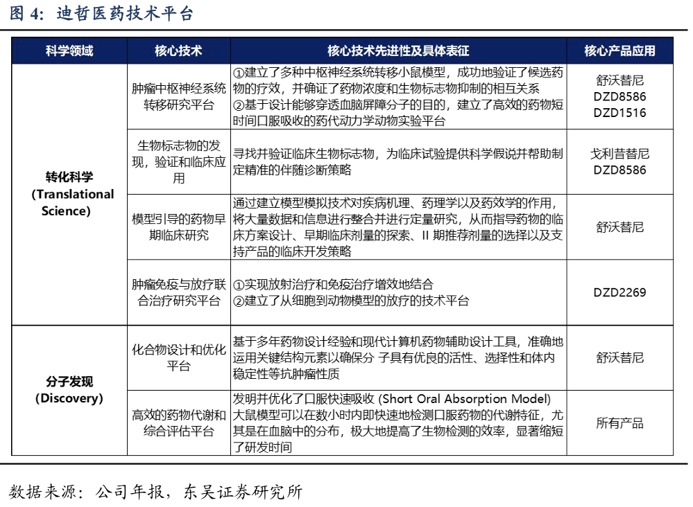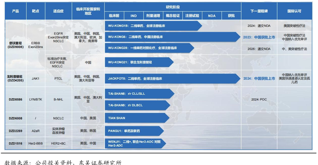 在研管线集中于恶性肿瘤治疗领域,集中在肺癌和血液瘤。所有产品均享有完整的全球权益,并采用全球同步开发的模式。公司拥有6款具备全球竞争力的产品管线,4款产品已实现临床端的概念验证,2款产品处在全球关键性临床试验阶段。其中,公司的核心产品舒沃替尼、戈利昔替尼已在中国获批上市,DZD8586、DZD6008、DZD2269、DZD1516处于国际多中心临床研究阶段。公司还储备了多个处于临床前研究阶段的候选创新药物,后续将继续聚焦在小分子治疗领域,以推出全球首创(First-in-class)和具有突破性潜力的治疗方法为目标。