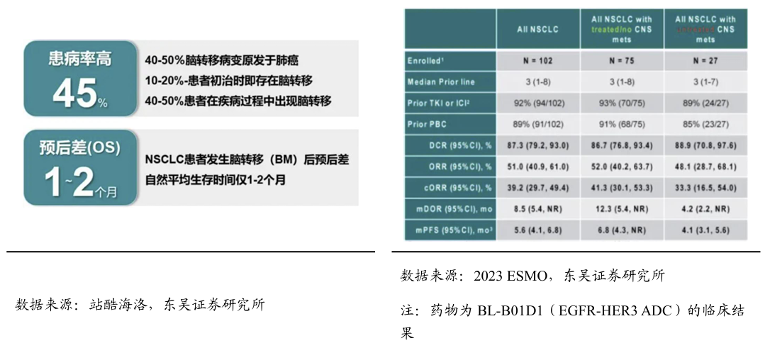 DZD6008是迪哲自主研发的、全新的针对NSCLC的小分子抑制剂,有望填补当前未被满足的临床空白,正在中国开展针对TKI治疗失败的EGFRm NSCLC的I期临床研究。有望今年在学术会议上更新早期临床结果。尤其是TKI耐药后的NCLCL的脑转移是导致患者死亡的主要原因,近30% EGFRm NSCLC患者在初次诊断时即存在脑转移,诊断后3年内脑转移的风险可能增至50-60%。目前包括ADC、双抗在内大分子药物穿透血脑屏障方面存在一定的局限性。