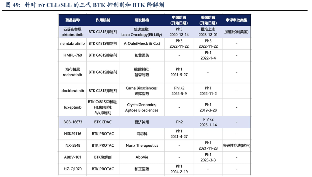 目前,1L CLL/SLL的患者仍以使用BTK抑制剂单药为主,耐药后可选择不同种BTKi再进行尝试,比如:可使用第三代BTK抑制剂吡托布鲁替尼,或者使用Bcl2抑制剂(维奈克拉)等,少数可以选择免疫疗法,包括奥妥珠单抗、利妥昔单抗联合疗法等。在研的BTK降解剂(PROTAC或CDAC)也在临床试验进行中,只有百济神州的BGB-16673读出了Ph1/2临床数据。