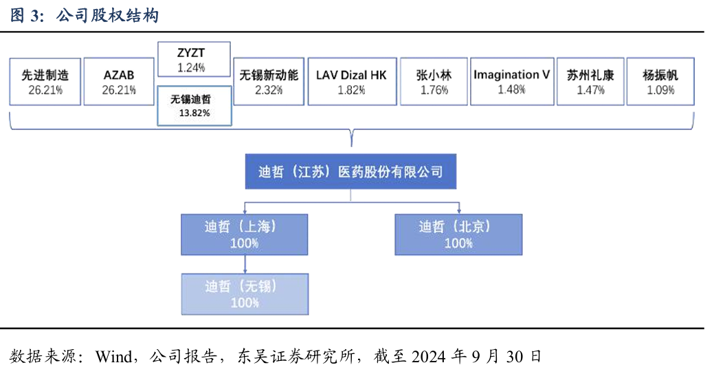 公司的股份主要集中于先进制造和AstraZeneca AB两大股东,无控股股东及实际控制人。截至2024年9月30日,两大主要股东持股比例均为26.21%。先进制造是由国投创新投资管理有限公司旗下基金管理,AZAB是阿斯利康的全资子公司。无锡迪哲与ZYTZ为迪哲的员工持股平台,合计持股15.06%,董事长张小林为ZYTZ与无锡迪哲执行事务合伙人无锡敦禾的最终实际控制人。公司共有三家全资子公司(包括间接子公司),其中迪哲上海主要从事医药行业内的技术开发等业务,迪哲北京则负责药品批发等工作,而迪哲无锡作为迪哲医药的间接子公司,则负责药品生产等工作。