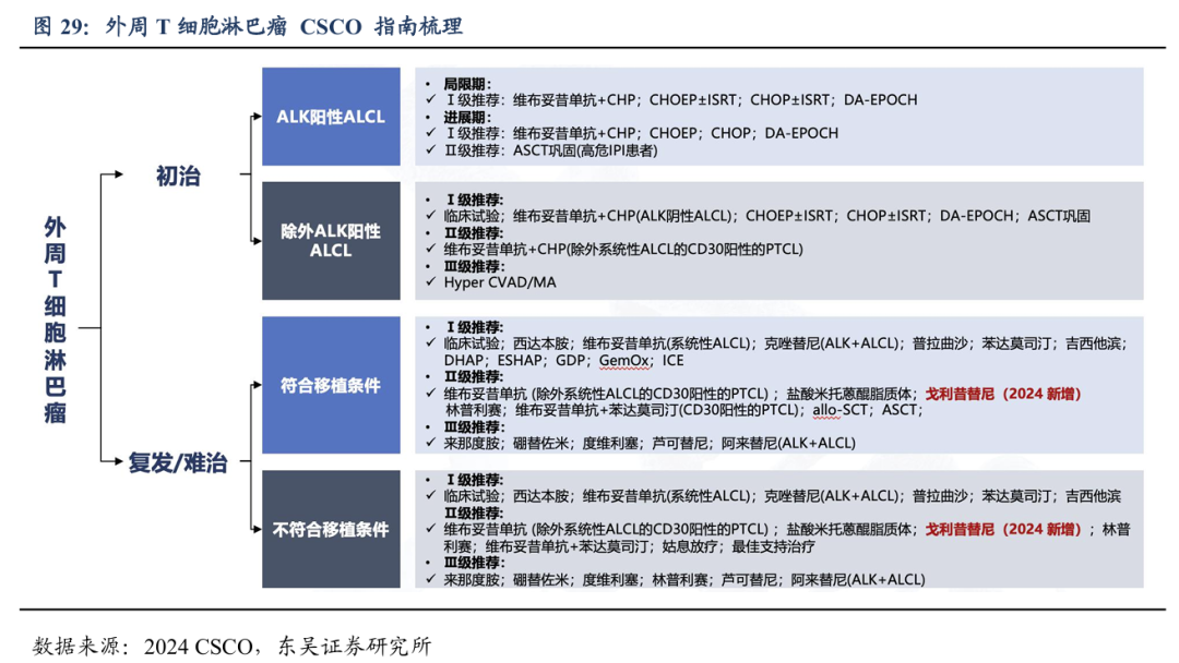 PTCL不同亚型的mOS仅为20个月左右,复发后治疗效果极为有限,3年生存率仅23%,OS仅5.8个月,该领域近十年没有创新药上市,目前尚缺乏非常有效的治疗方法。针对初治的PTCL患者以CHOP样的四药化疗方案为主。根据《CSCO淋巴瘤诊疗指南(2024版)》,PTCL一线治疗方案主要包括:维布妥昔单抗(CD30-MMAE ADC)联合CHP(环磷酰胺+阿霉素+强的松)、CHOP(环磷酰胺+阿霉素+长春新碱+泼尼松)、CHOEP(环磷酰胺、多柔比星、长春新碱、依托泊苷、强的松)和EPOCH(依托泊苷、强的松、长春新碱、环磷酰胺、多柔比星)。如果有ALK或者CD30等驱动基因阳性的患者优先选择ALK抑制剂或CD30 ADC。仅有少数患者经上述化疗后获得良好生存,大部分PTCL患者仍然预后不佳。对于复发或难治性(r/r)的PTCL,5年生存率不足30%,选择使用二线治疗方案,同样首选临床试验,其它单药方案的选择有西达本胺(HDAC抑制剂)、普拉曲沙(叶酸拮抗剂)、克唑替尼(ALK抑制剂)和苯达莫司汀(双功能基烷化剂)等。戈利昔替尼2024年首次获2024 CSCO指南的Ⅱ级推荐,用于治疗r/r PTCL患者。