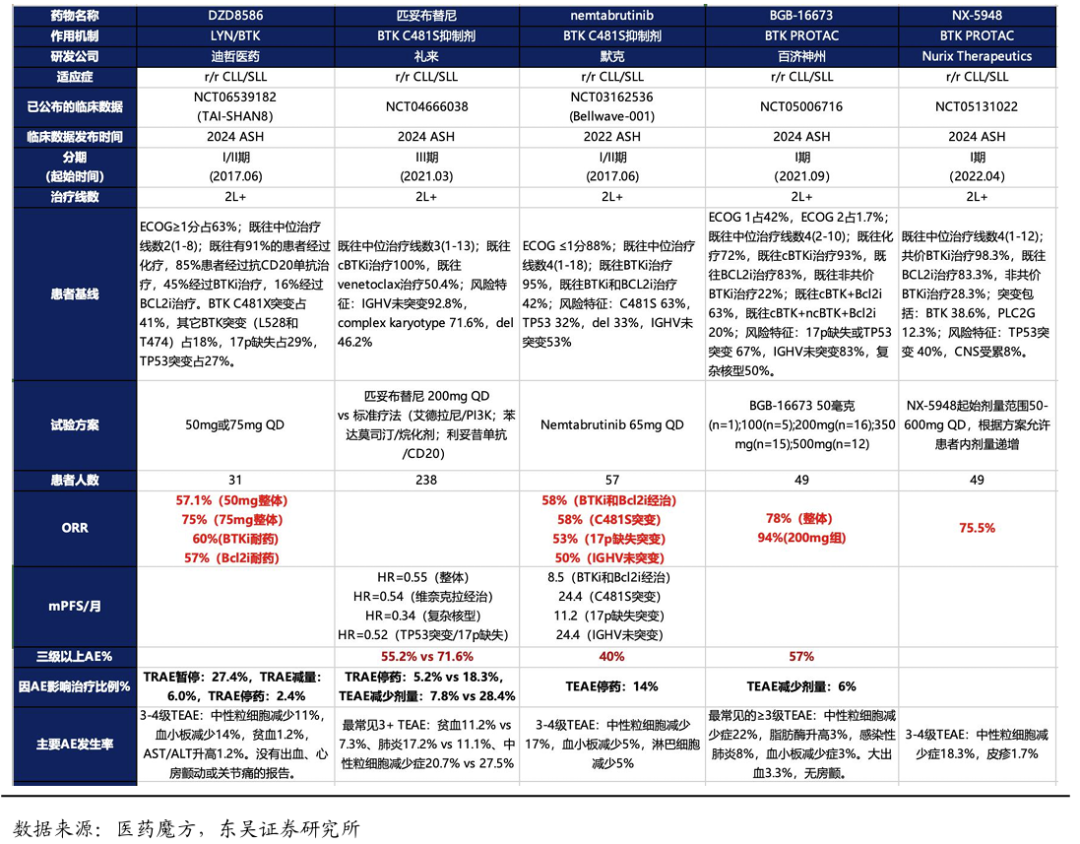 2024年底的ASH会议上,DZD8586针对r/r CLL/SLL 的II期研究结果(TAI-SHAN8,数据截至2024年10月20日)显示:中位治疗线数为2,既往有91%的患者经过化疗,85%患者经过抗CD20单抗治疗,45%经过BTKi治疗,16%经过BCL2i治疗。在50mg和75mg剂量下的ORR分别为57.1%和75%。在既往接受过BTKi和BCL2i的患者中ORR分别为60%和57%。在携带经典BTKi耐药的(C481X突变)和非BTK依赖性突变中均观察到肿瘤缓解。安全性良好,药物相关导致的剂量暂停、减量和停药的发生率分别为27.4%、6.0%和2.4%,主要为血液学毒性,无药物相关死亡。