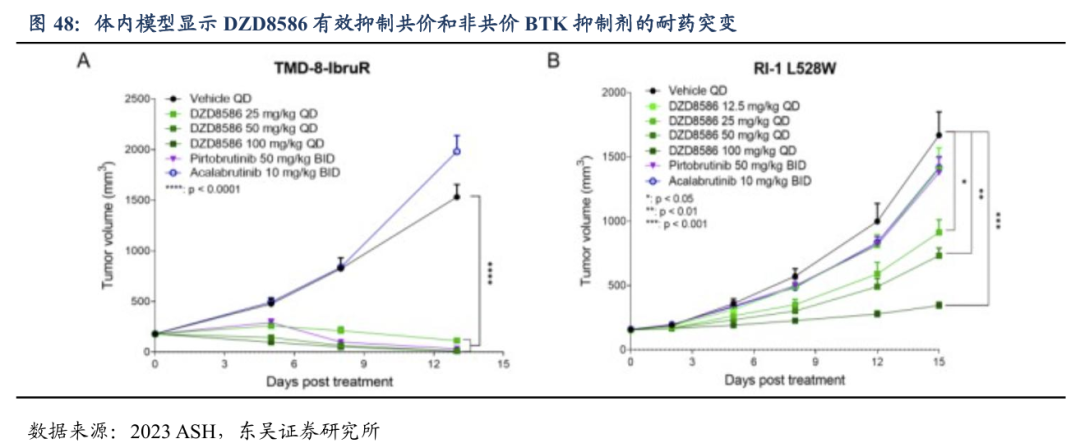 DZD8586(非共价LYN/BTK双靶点抑制剂)可完全穿透血脑屏障,覆盖B-NHL全亚型。可同时阻断BTK依赖性和非依赖性BCR信号通路,有效抑制多种B-NHL亚型细胞生长且完全穿透血脑屏障。公司在全球均布局了化合物专利,专利有效期我们预计2040年到期。针对临床前实验显示DZD8586在DLBCL和CLL模型中显示出已上市的BTK抑制剂(阿卡替尼和吡托布鲁替尼)更强的抗肿瘤效果。