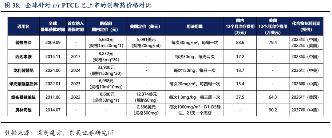 从治疗费用看,价格合适,医保后销售有望放量:戈利昔替尼2024年6月上市后,2024年底成功通过国家医保谈判,进入国家医保目录,2025年1月开始执行医保价格。12个月的治疗费用为18.7万元(按医保价格算)。相比国内没有进入医保的普拉曲沙用药费用优势明显,略高于西达本胺的年治疗费用。戈利昔替尼的化合物专利我们预计2036年到期,目前还没有普拉曲沙、西达本胺和米托蒽醌脂质体的仿制药上市。我们预计最近几年戈利昔替尼的销售不会受到仿制药的冲击。