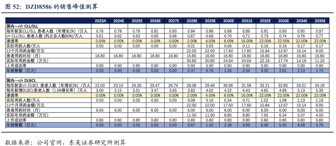 渗透率假设:针对r/r CLL/SLL和r/r DLBCL适应症,DZD8586的竞争格局良好,潜在同类最佳分子。假设国内峰值渗透率为22%。