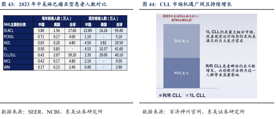 根据SEER和中国肿瘤诊疗指南,中国发病率最高的非霍奇金淋巴瘤(NHL)是DLBCL,每年新增3.8万人的DLBCL患者,存量患者近23万人;美国发病率第一的NHL是CLL/SLL,预计美国每年新增2万人CLL/SLL,存量患者约20万人。根据IQVIA分析,2023年全球CLL/SLL的市场有95亿美金,未来市场空间有望达到120亿美金。