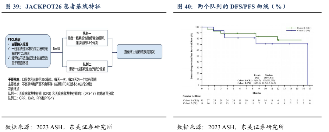 戈利昔替尼对于PTCL患者一线系统性治疗后的维持/巩固治疗效果显著。PTCL患者在接受一线标准治疗后,约40%的CR患者和80%的PR患者在初次肿瘤缓解后的2年内会出现疾病复发或进展,患者预后极差,缺乏标准的维持治疗。临床II期(JACKPOT26)的研究结果表明:患者一线系统性治疗CR的患者(队列1),中位随访12个月,76.7%的患者未观察到DFS事件(疾病进展);一线系统治疗PR的患者(队列2),中位随访时间10个月,mPFS=16.7个月,61%患者仍没有发生疾病进展。最常见的3级及以上的TEAE为血液学毒性,大多数可恢复或临床可管理且耐受性良好。
