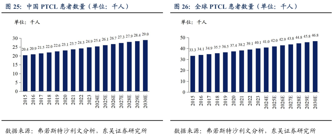 根据GLOBOCAN数据统计,2022年我国新增80,829例NHL患者,全球新增 553,010例NHL患者。据此测算,2023年我国约有24.9千人新增PTCL患者,全球约有40.1千人新增PTCL患者。根据弗若斯特沙利文的分析,PTCL患者2024年至2030 年的年复合增长率为2.2%,预计2030年我国和全球新发病例分别会达到29千人和46.8千人。