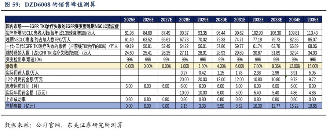 渗透率假设:针对晚期、转移性EGFRm NSCLC适应症的竞争虽然激烈,但是DZD6008口服给药,透脑性好,小分子领域竞争格局良好,潜在同类最佳小分子。假设国内峰值渗透率为15%。