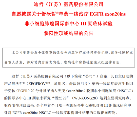 日前,迪哲医药宣布其核心产品舒沃替尼(舒沃哲?)在一线治疗EGFR 20号外显子插入突变(ex20ins)晚期非小细胞肺癌(NSCLC)的国际多中心Ⅲ期临床研究“悟空28”(WU-KONG28)中,达到主要研究终点,取得阳性顶线结果。这一里程碑突破,不仅填补了该领域一线治疗的全球空白,更让本就充满挑战的EGFR ex20ins靶向治疗赛道迎来格局重塑。