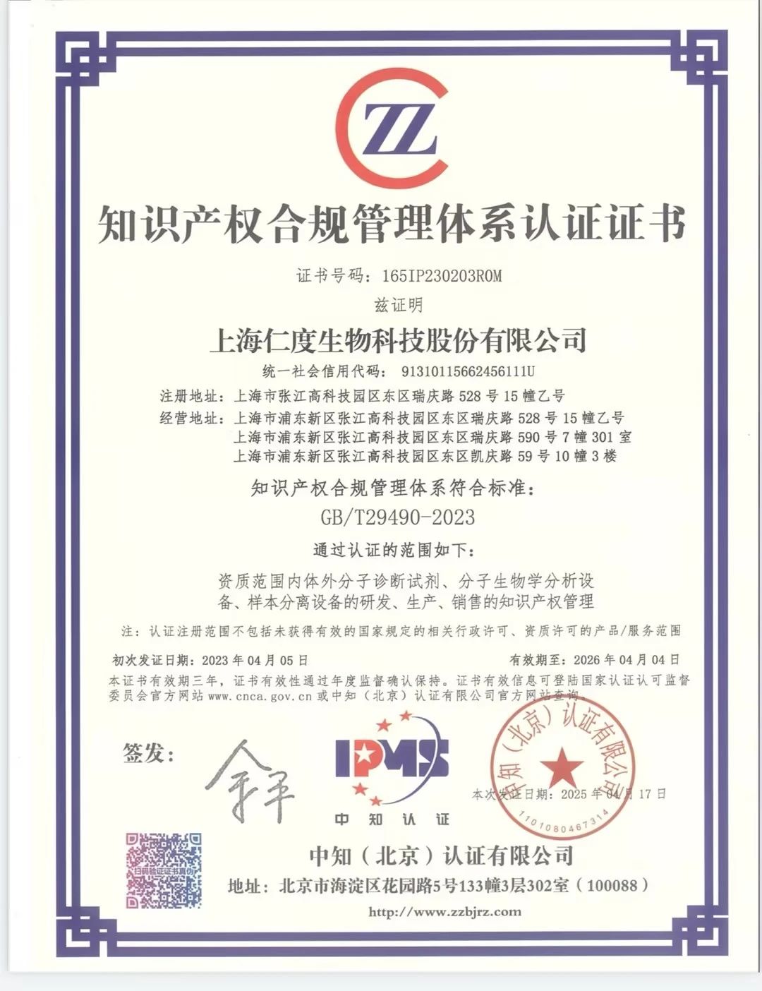 2025年4月26日,我们迎来第25个世界知识产权日,在这个具有特殊意义的日子里,仁度生物再次以卓越的创新实力和规范化的管理能力赢得行业认可——公司顺利通过GB/T 29490-2023知识产权合规管理体系认证,标志着其在知识产权管理领域已达到新版国家标准要求,为持续提升科研创新能力和核心竞争力奠定了坚实基础。