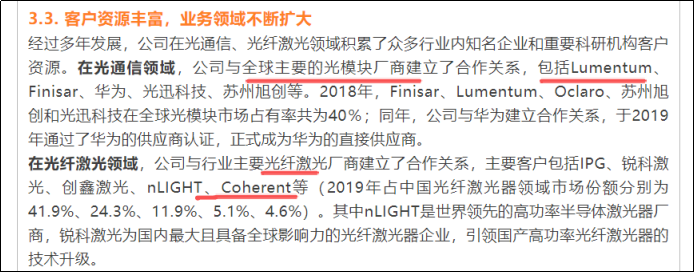 腾景科技 受益于本轮算力硬件细分的光模块,是国内A股市场中较为稀缺的光学精密制造平台公司,这是估值溢价之一。另外就是公司产品的技术壁垒。根据招股书和年报来看,腾景的核心产品是光模块中不可或缺的核心部件,主要可分为两大类:光通信和光纤激光领域。