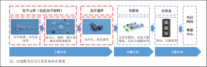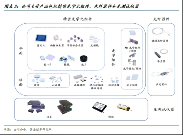 公司成立于2013年,2021年于上交所科创板上市,核心业务是研发、生产和销售精密光学元组件、光纤器件、光测试仪器的高新技术企业,产品主要应用于光通信、光纤激光领域,以及半导体设备、生物医疗、消费类光学等领域。2013年从光纤激光起步,2016年切入光通信领域,2018年起向多领域拓展。