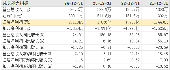 首药控股 近年连续亏损,2021年至2024年,公司归属于上市公司股东的净利润分别为-1.449亿元、-1.738亿元、-1.856亿元、-2.119亿元,归属于上市公司股东的扣除非经常性损益的净利润分别为-1.626亿元、-1.990亿元、-1.994亿元、-2.350亿元。