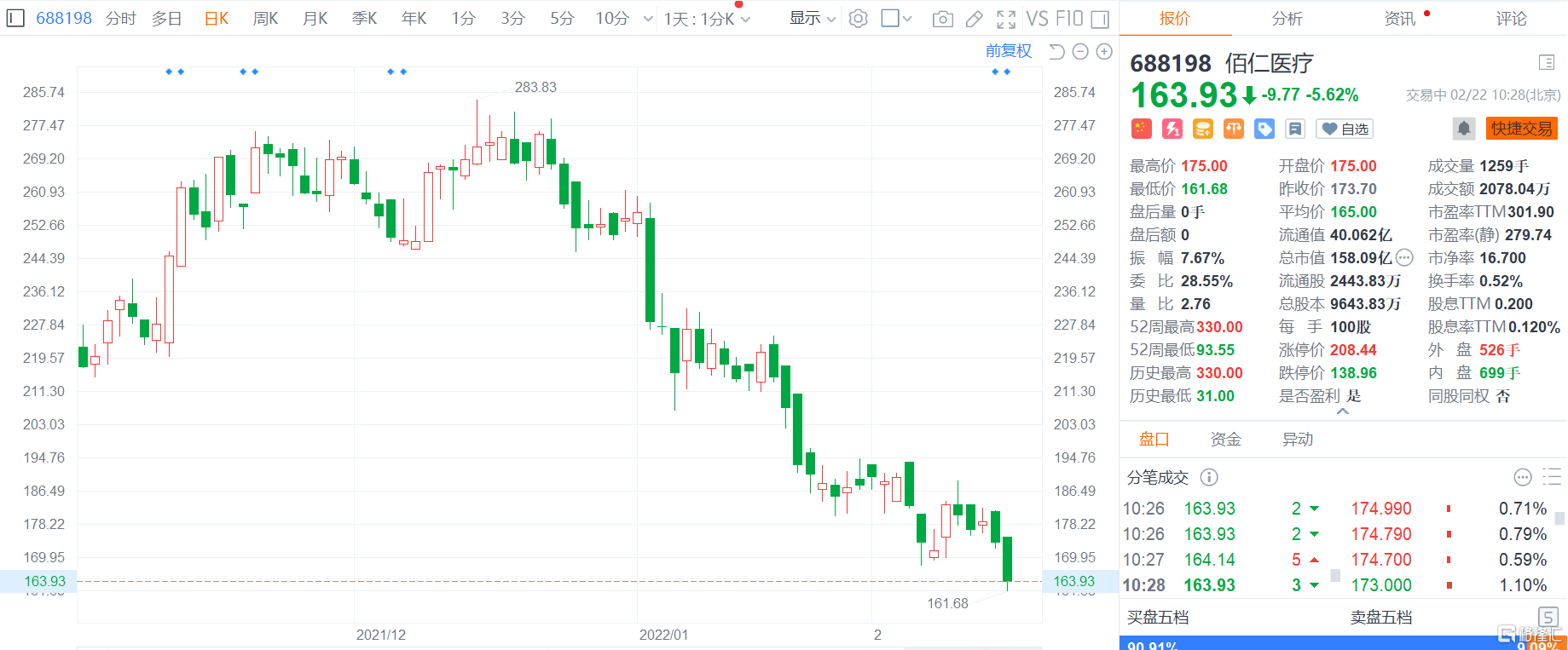 自去年9月股价创下历史新高330元后,佰仁医疗(688198.SH)近期不断下挫,现跌5.62%,报163.93元,股价已经腰斩,最新总市值158亿元。佰仁医疗昨日发布2021年度业绩快报,实现营业总收入2.52亿元,同比增长38.45%;归属于母公司所有者的净利润5260.7万元,同比下降6.93%;归属于母公司所有者的扣除非经常性损益的净利润3709万元,同比下降9.62%;基本每股收益0.55元。