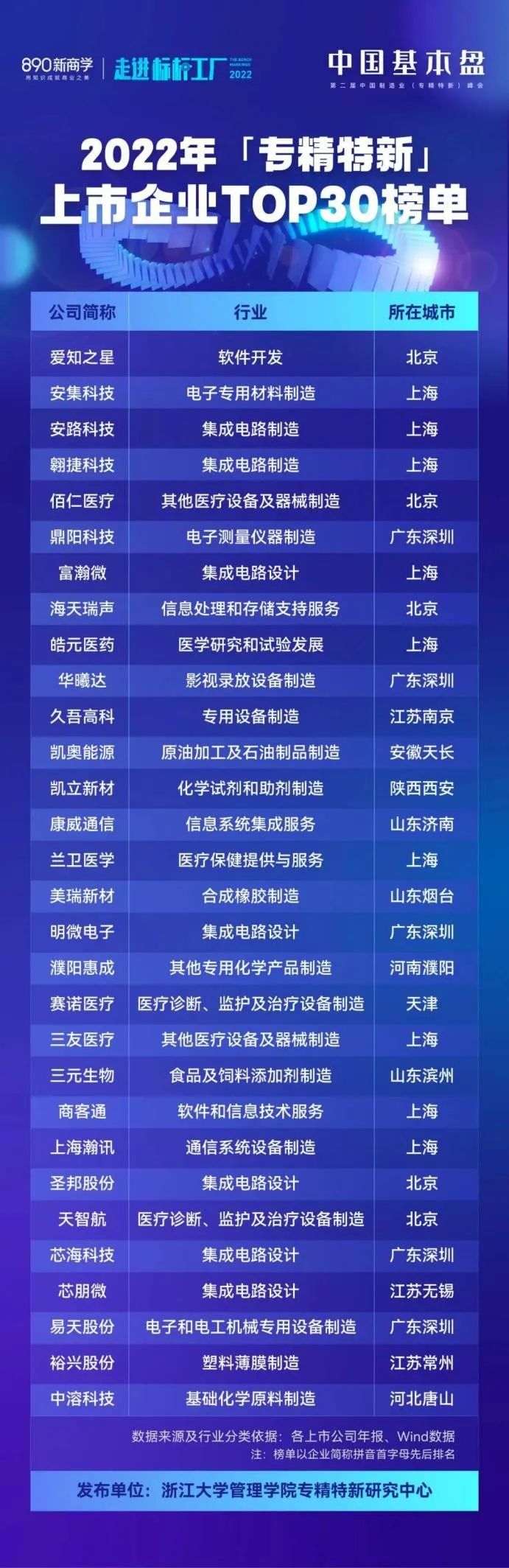 为此,浙江大学管理学院教授、浙江大学管理学院专精特新研究中心副主任郭斌老师同团队研发了一套“专精特新上市企业评估模型”,利用公开、客观的企业年报,对700余家专精特新上市企业进行建模,分析年报中的文本信息、财务数据、专利数据等,评选出了“2022年专精特新上市企业TOP30榜单”。