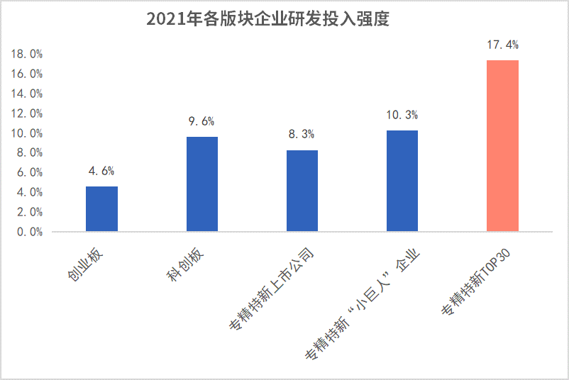 值得一提的是,17.4%这一数据,也大幅领先于科创板及创业板的上市企业的9.6%和4.6%。在我国,科创板强调“科技”、创业板强调“创新”,在二者上市的公司均属需要进行高研发投入。