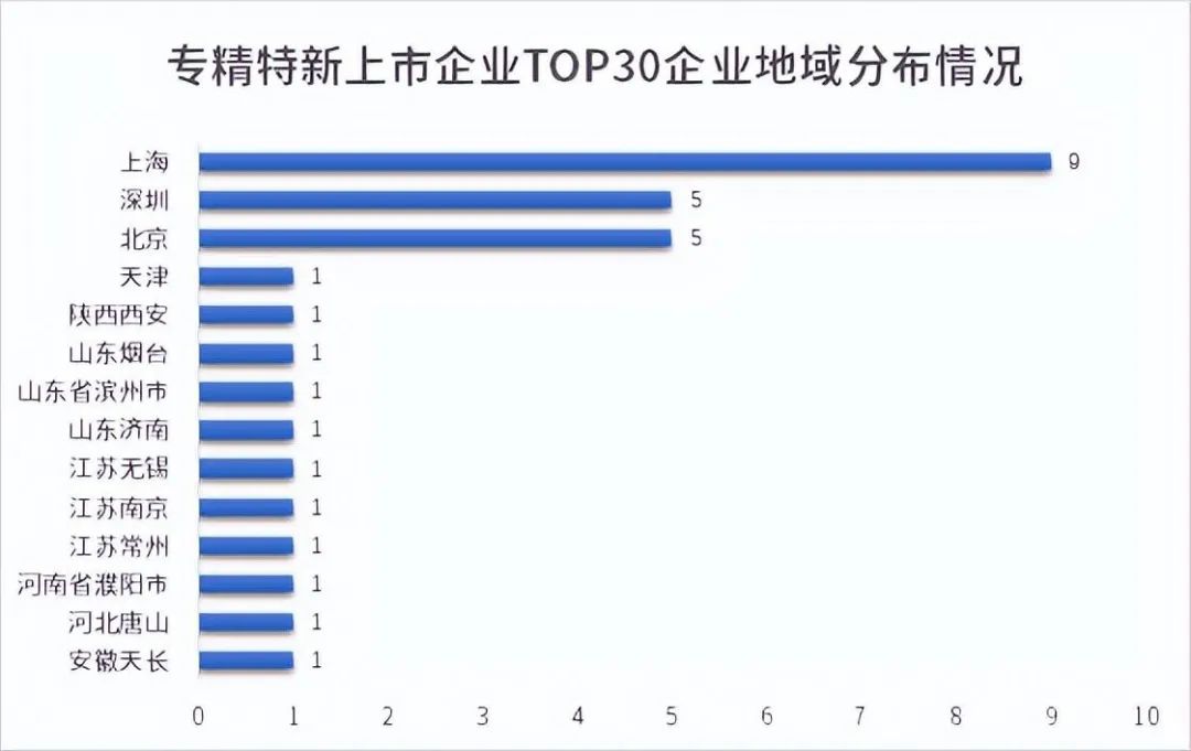 从地域分布情况看,77.3%的TOP30企业仍主要集中在一线城市,北京、上海、深圳依然备受专精特新上市公司的青睐。