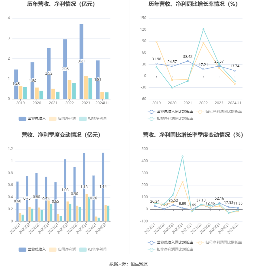 根据半年报,公司第二季度实现营业总收入1.14亿元,同比增长11.35%,环比增长50.03%;归母净利润2687.09万元,同比下降17.38%,环比增长222.98%;扣非净利润2618.62万元,同比下降9.29%,环比增长310.58%。