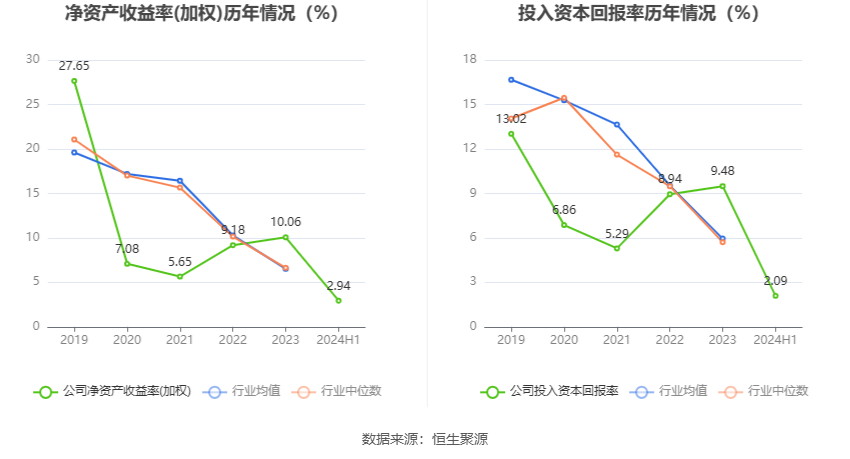 数据显示,2024年上半年公司加权平均净资产收益率为2.94%,较上年同期下降1.01个百分点;公司2024年上半年投入资本回报率为2.09%,较上年同期下降1.83个百分点。