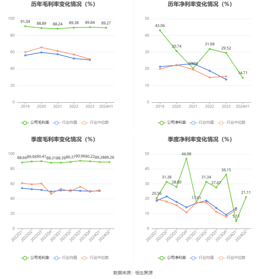 2024年上半年,公司毛利率为89.27%,同比上升0.28个百分点;净利率为14.71%,较上年同期下降11.32个百分点。从单季度指标来看,2024年第二季度公司毛利率为89.26%,同比下降0.11个百分点,环比下降0.02个百分点;净利率为21.11%,较上年同期下降10.23个百分点,较上一季度上升16.00个百分点。