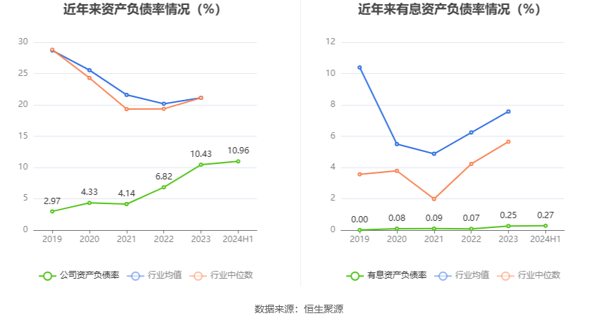 在偿债能力方面,公司2024年上半年末资产负债率为10.96%,相比上年末上升0.53个百分点;有息资产负债率为0.27%,相比上年末上升0.02个百分点。