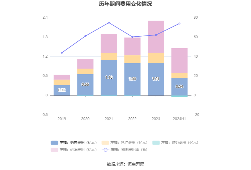 2024年上半年,公司期间费用为1.41亿元,较上年同期增加2938.15万元;期间费用率为74.07%,较上年同期上升7.35个百分点。其中,销售费用同比下降5.97%,管理费用同比下降6.12%,研发费用同比增长95.78%,财务费用由去年同期的-39.81万元变为-434.39万元。