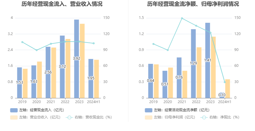 2024年上半年,公司营业收入现金比为102.47%,净现比为29.61%。