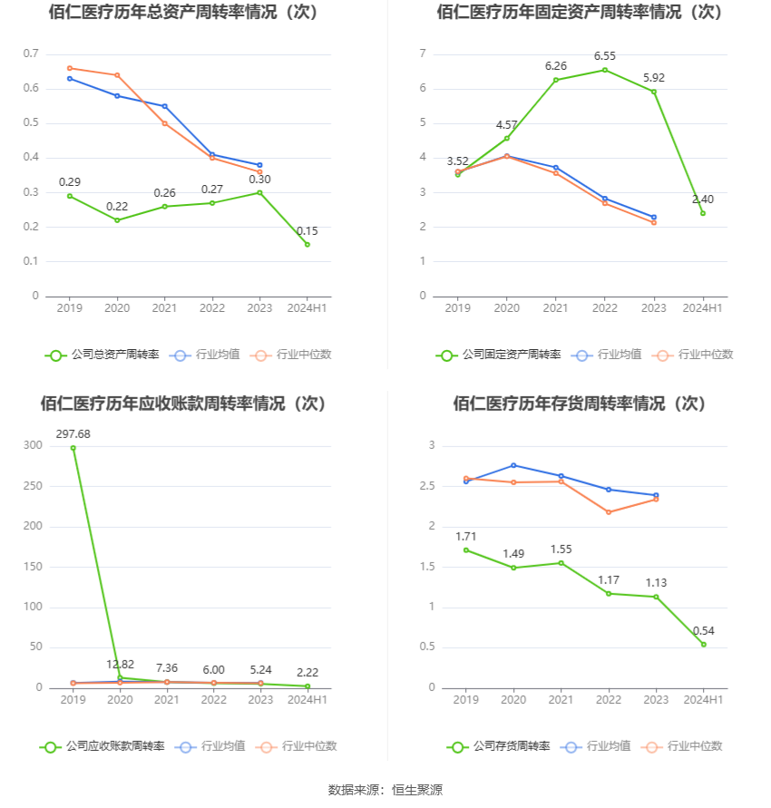 营运能力方面,2024年上半年,公司公司总资产周转率为0.15次,上年同期为0.14次(2023年上半年行业平均值为0.19次,公司位居同行业37/47);固定资产周转率为2.40次,上年同期为2.95次(2023年上半年行业平均值为1.18次,公司位居同行业8/47);公司应收账款周转率、存货周转率分别为2.22次、0.54次。