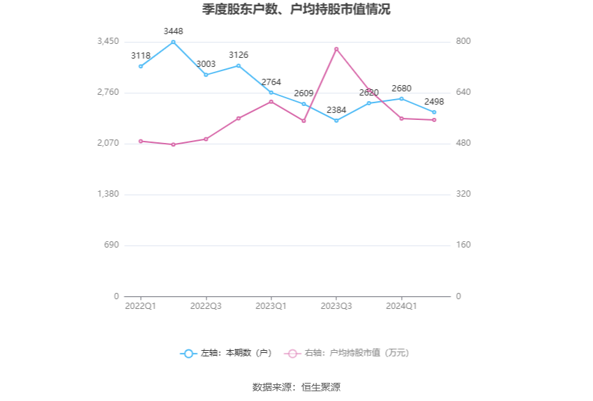 筹码集中度方面,截至2024年上半年末,公司股东总户数为2498户,较一季度末下降了182户,降幅6.79%;户均持股市值由一季度末的559.11万元下降至554.90万元,降幅为0.75%。