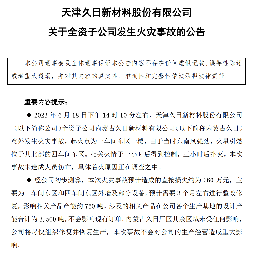 6月19日晚间公告称,6月18日下午14时10分左右,公司全资子公司内蒙古久日新材料有限公司(下称“内蒙古久日”)意外发生火灾事故,未造成人员伤亡,具体着火原因正在调查中。
