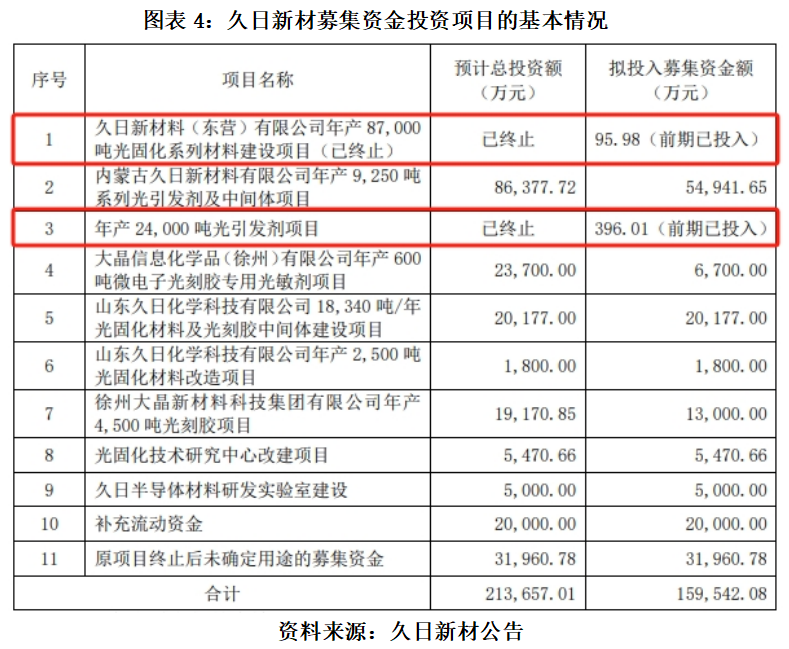 2022年12月,久日新材披露《关于变更及终止部分募集资金投资项目的公告》,提及拟变更并终止募投项目:久日新材料(东营)有限公司年产87000吨光固化系列材料建设项目(以下简称“东营久日项目”)。