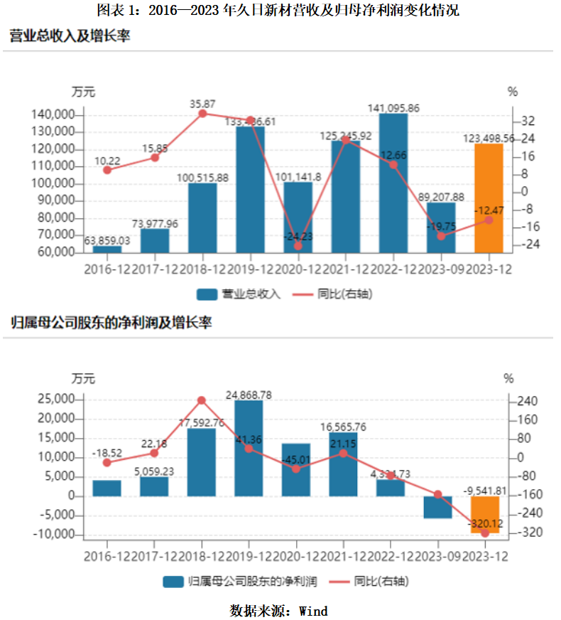 到了2023年,久日新材业绩更是一泻千里,直接由盈转亏。