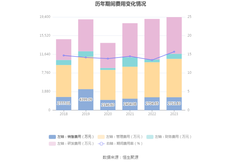 2023年,公司期间费用为1.94亿元,较上年同期增加392.88万元;期间费用率为15.70%,较上年同期上升2.23个百分点。其中,销售费用同比增长0.27%,管理费用同比增长9.6%,研发费用同比下降9.58%,财务费用同比增长89.23%。