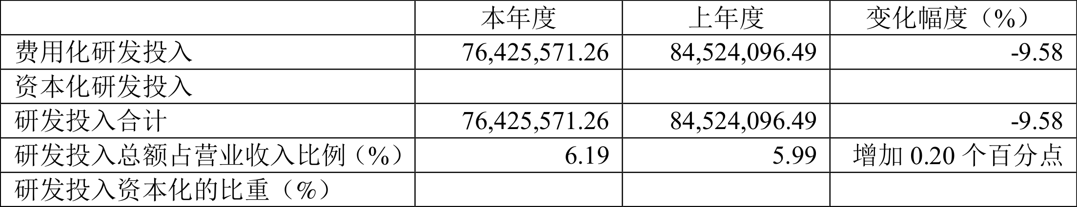 2023年全年,公司研发投入金额为7642.56万元,同比下降9.58%;研发投入占营业收入比例为6.19%,相比上年同期上升0.2个百分点。