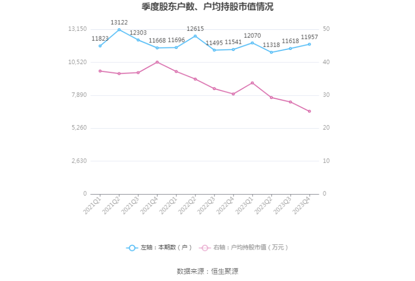 筹码集中度方面,截至2023年年末,公司股东总户数为1.2万户,较三季度末增长了339户,增幅2.92%;户均持股市值由三季度末的27.98万元下降至25.14万元,降幅为10.15%。