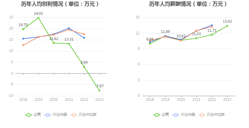 截至2023年末,公司员工总数为1254人,人均创收98.48万元,人均创利-7.67万元,人均薪酬13.42万元,较上年同期分别变化3.02%、-360.95%、14.59%。
