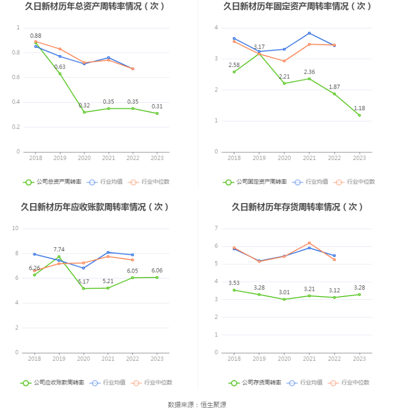 营运能力方面,2023年,公司公司总资产周转率为0.31次,上年同期为0.35次(2022年行业平均值为0.67次,公司位居同行业66/74);固定资产周转率为1.18次,上年同期为1.87次(2022年行业平均值为3.43次,公司位居同行业56/74);公司应收账款周转率、存货周转率分别为6.06次、3.28次。