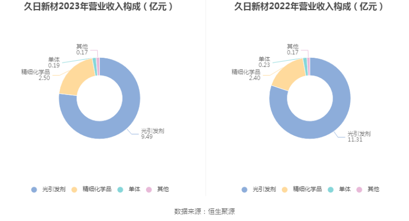 分产品看,光引发剂、精细化学品、单体2023年毛利率分别为10.28%、4.35%、1.86%。