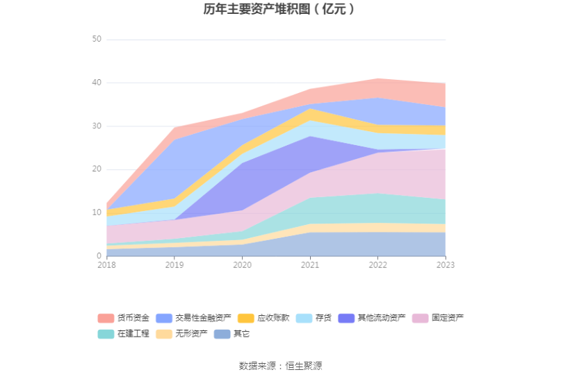 资产重大变化方面,截至2023年年末,公司固定资产较上年末增加23.62%,占公司总资产比重上升6.22个百分点;交易性金融资产较上年末减少32.83%,占公司总资产比重下降4.71个百分点;货币资金较上年末增加22.74%,占公司总资产比重上升2.86个百分点;在建工程较上年末减少16.52%,占公司总资产比重下降2.33个百分点。